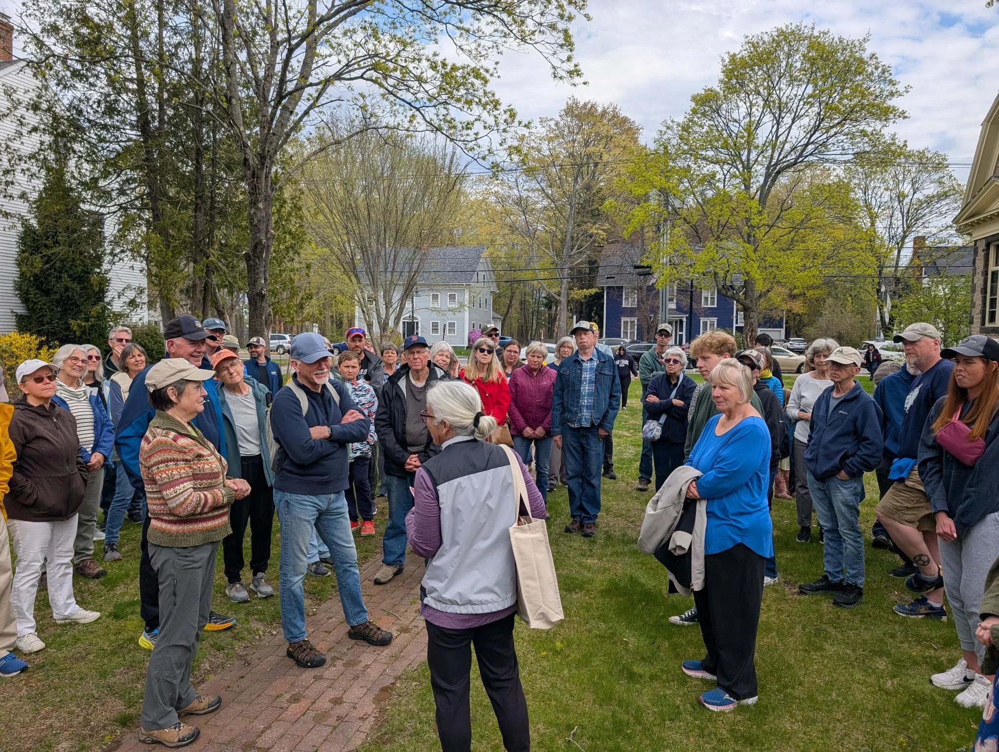 Linda Whitten (back towards camera) leads the 2025 GPL “Jane’s Walk” tour through Gorham