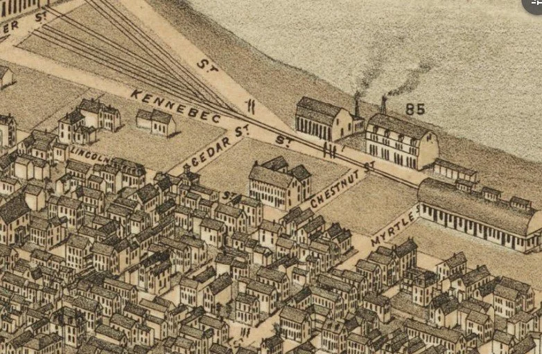 Railway buildings from the 1876 Bird’s Eye View Portland Maine Map